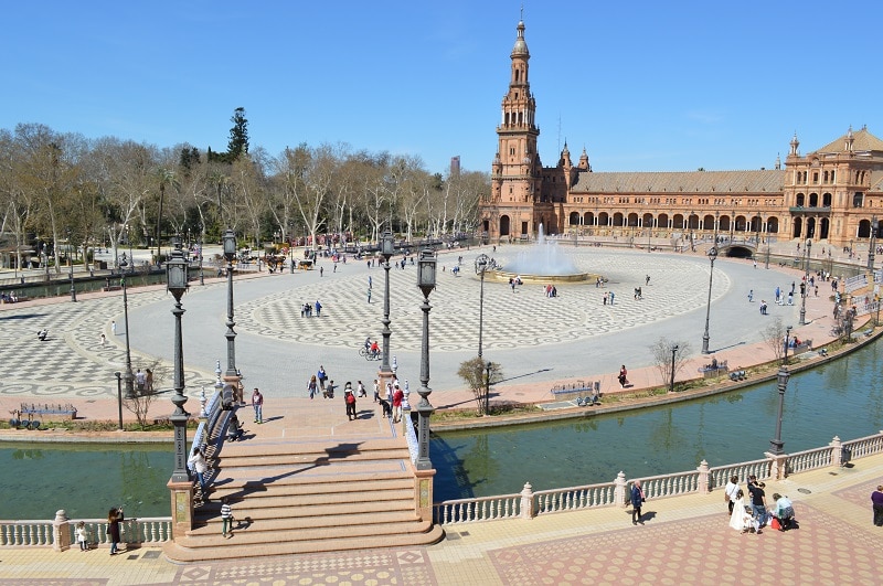 [dropcap]C[/dropcap]omme souvent en Espagne, la Plaza de España est impressionnante mais celle-ci est particulièrement travaillée. Construite pour l’exposition Iberico-Américana, la Plaza de España de Séville est particulièrement magnifique. Pas de description trop pompeuse ici, je vous laisse le plaisir de la découvrir par vous-mêmes. A noter que c’est un lieu privilégié pour les photos des jeunes enfants qui viennent de procéder à leur communion. Vous croiserez peut-être comme nous ces jeunes enfants prenant la pause sur cette place propice aux belles prises de vues.