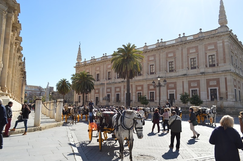 - Si vous ne passez que deux jours à Séville, je vous conseille de faire un tour de calèche. Certes c’est un peu cliché mais c’est l’occasion de faire le tour des principaux monuments en 1 heure environs. En plus, pas d’arnaque (en principe) car les prix sont les mêmes partout puisque fixés par les autorités. C’est 45 euros en temps normal que vous soyez seul ou à plusieurs. C’est un bon moyen d’avoir un belle aperçu de la ville avec en prime les commentaires du driver espagnol s’il est bavard et bien luné. Intéressant si vous captez un peu l’espagnol sinon c’est vrai davantage pour se sentir vraiment en Espagne et rien d’autre.