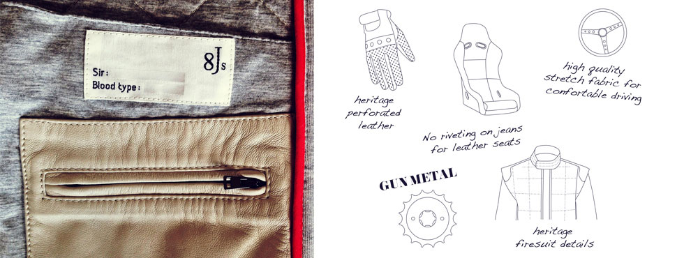 Chaque pièce à ses petits traits de caractère 8Js. Par exemple nos jeans n’ont jamais de rivets afin de ne pas abîmer les sièges des voitures. Ils sont aussi en tissus stretch pour optimiser le confort de conduite. D’autre part la bande rouge le long du bras à la Jim Clark, que l’on retrouve sur des pièces manches longues, t-shirts ou polos.