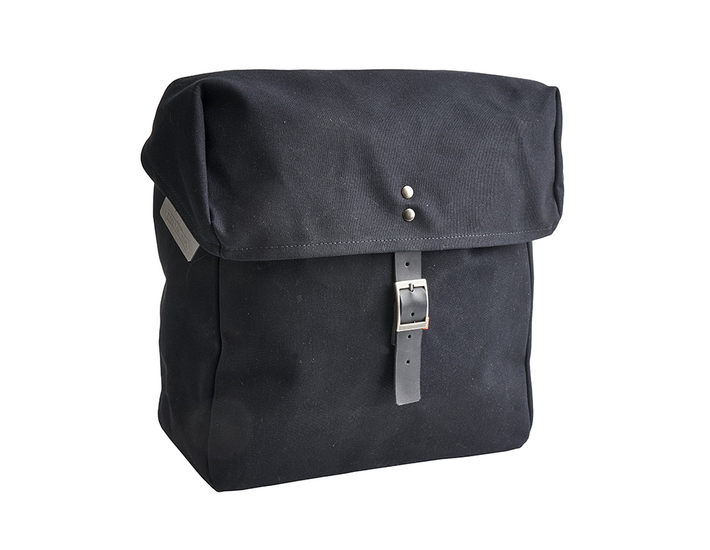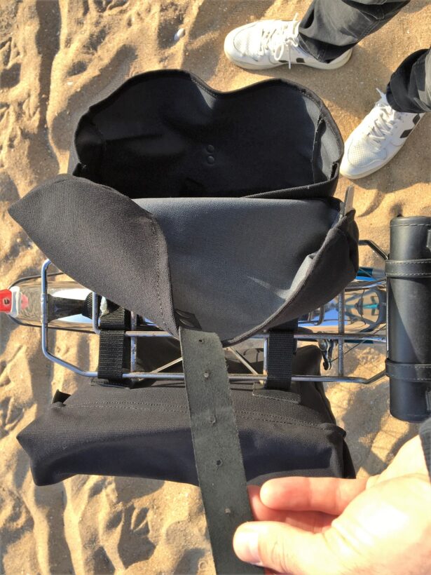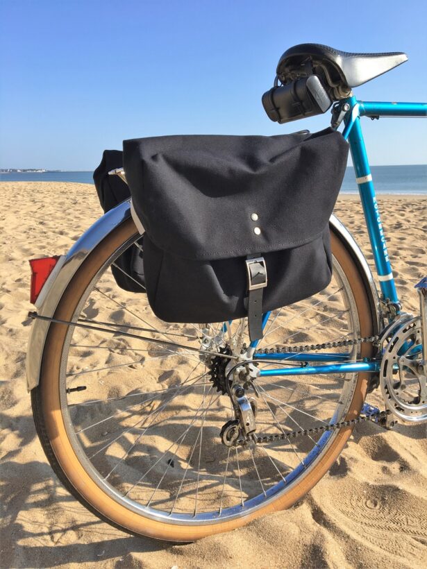 Cette sacoche en toile souple est dotée d’un double fond toilé ce qui permet de garantir une résistance accrue et la possibilité d’ajouter une plaque rigide dans le fond de la sacoche. C’est d’ailleurs ce que j’ai fait afin de bien maintenir la sacoche sur le bord du porte-bagage arrière et éviter ainsi qu’elle ne frotte sur les rayons de la roue. La sangle de fermeture de cette sacoche est en cuir étanche et souple. Elle ajoute une touche d’élégance à ce produit qui n’en manque pourtant pas.