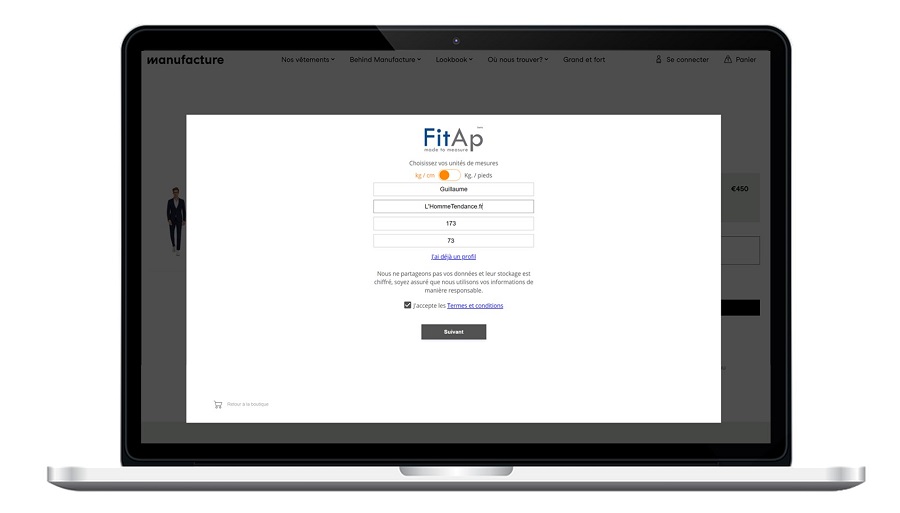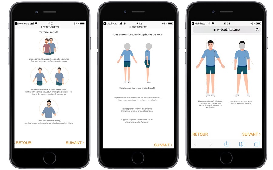 En renseignant votre taille et votre poids, le système de prise de mesure FitAp permet de connaître votre morphologie en seulement deux photos: une de face et une de profil.