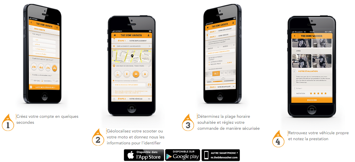 La société The Bike Washer propose des prestations géolocalisées pour motards et scootéristes, effectuées directement sur le lieu de stationnement du véhicule. Des prestations comme le nettoyage sans eau ou de la petite mécanique (très prochainement) qui se commandent très facilement depuis une application mobile (IOS et Android) ou directement depuis le site internet.