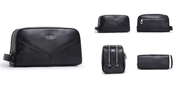 Voici le top de notre sélection. Cette pochette en cuir est tout simplement parfaite. Pour un poids de 394 grammes et 26 cm de longueur, vous avez de la place pour mettre tout vos produits de beauté. L’extérieur de la trousse de toilette pour homme est faite en cuir de vachette, une matière très douce au toucher. Vous pouvez y placer différents objets : un porte-carte y est intégré. Vous pouvez également y insérer votre portable, une pochette est prévue à cet effet. Avec une capacité de 20 litres, vous avez de quoi de la place pour mettre les produits les plus importants.