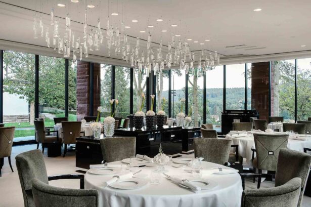Avant de découvrir la cuisine du duo de chefs Paul Stradner, deux étoiles au Brenner’s de Baden Baden et Jean-Georges Klein, chef historique de la Villa, ancien 3 étoiles à L’Arnsbourg, passage obligé au salon. On y savoure un cocktail ou un whisky The Macallan douillettement lové dans un grand canapé orné de motifs de cristal ou dans un fauteuil « Femme Ailée » signés Lalique Maison.